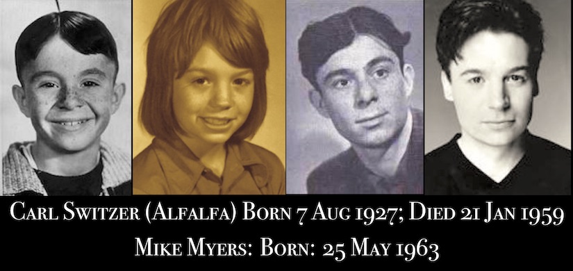 Dr. Carl Sagan Returned? Thank GOD I caught this stunning short, just wish it wasn't second-hand. I asked the guy who posted it to direct me to the original for evidence that he's Dr. Sagan, but he blew me off, probably thinks I'm nuts. Mike Myers & Carl Switzer (Alfalfa) I stumbled on this recently and haven't dug too deeply yet, but Carl Switzer, 'Alfalfa in the classic Our Gang, died unexpectedly and tragically young. And it's common to return quickly when a strong purpose is left unfulfilled. Both Carl Switzer and Mike Myers were child actors with charm and uniquely similar features. And their birth charts have enough connections to make it feasible. Can't fit a round soul in a square hole.