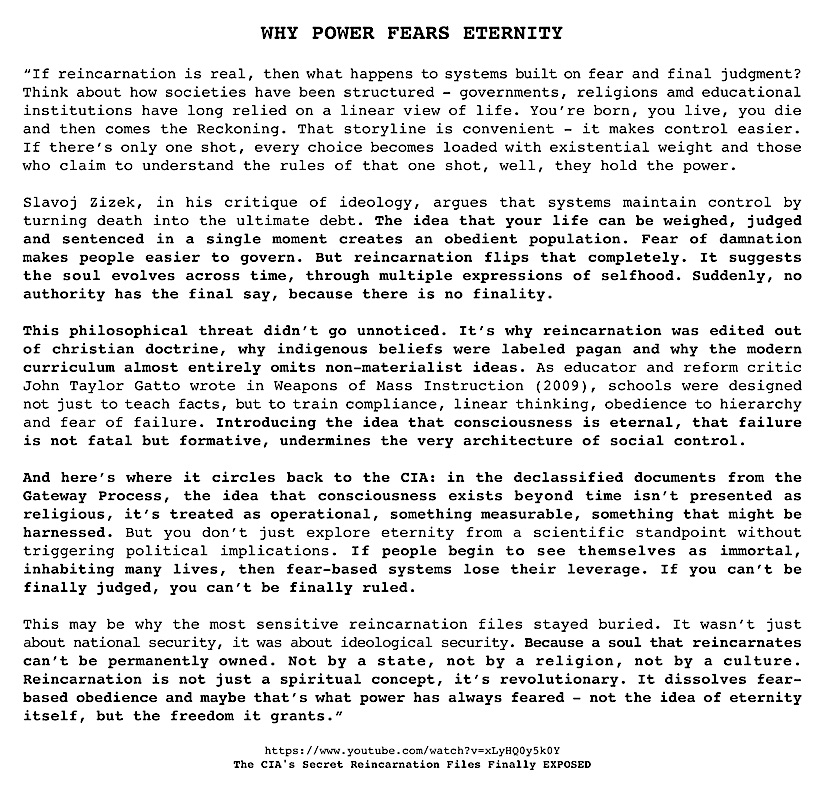 And here's a small riveting excerpt of a powerful, eight+ hour narration on reincarnation, straight from the X-files of the CIA: |